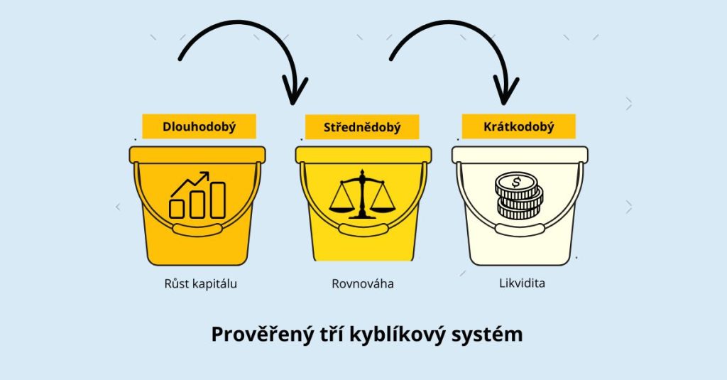 Pro přehledné rozdělení prostředků se mi osvědčil prověřený systém tří kyblíků, který pomáhá sladit krátkodobé, střednědobé a dlouhodobé investice.
